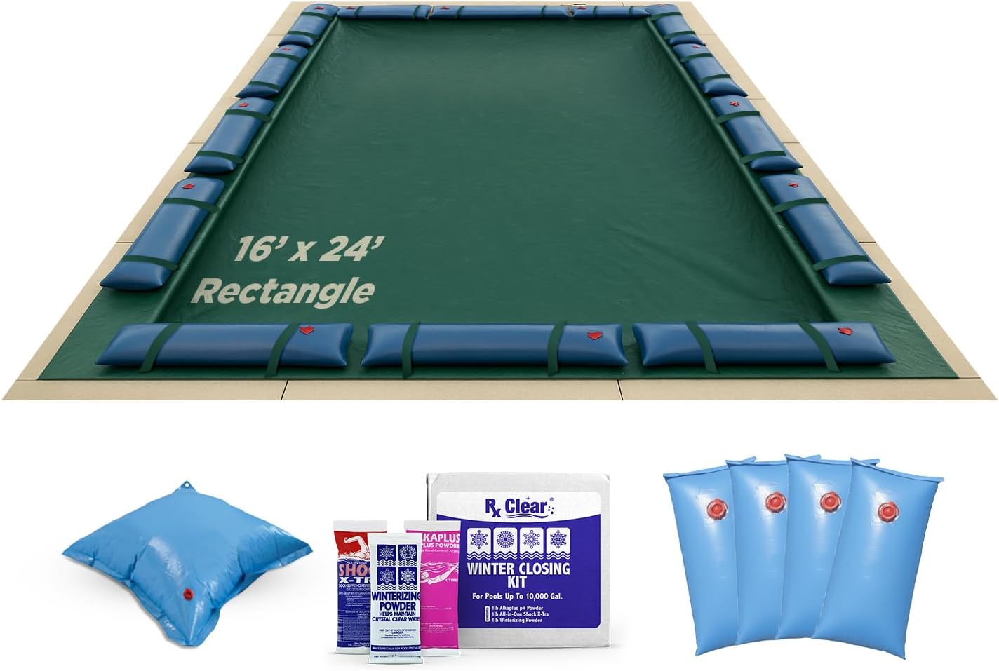 • BUILT TO LAST - Ripstopper Winter Cover features a super-strength interlock weave of polyethylene fabric that yields 3 times the normal tear strength of regular winter covers. A large 4 ft overlap making it a 16' round cover, allows for installation on virtually all above ground pools. Includes a 4’ x 4’ air pillow, 20,000 gallon Winter Kit, and 1 Roll of Winter Cover Seal