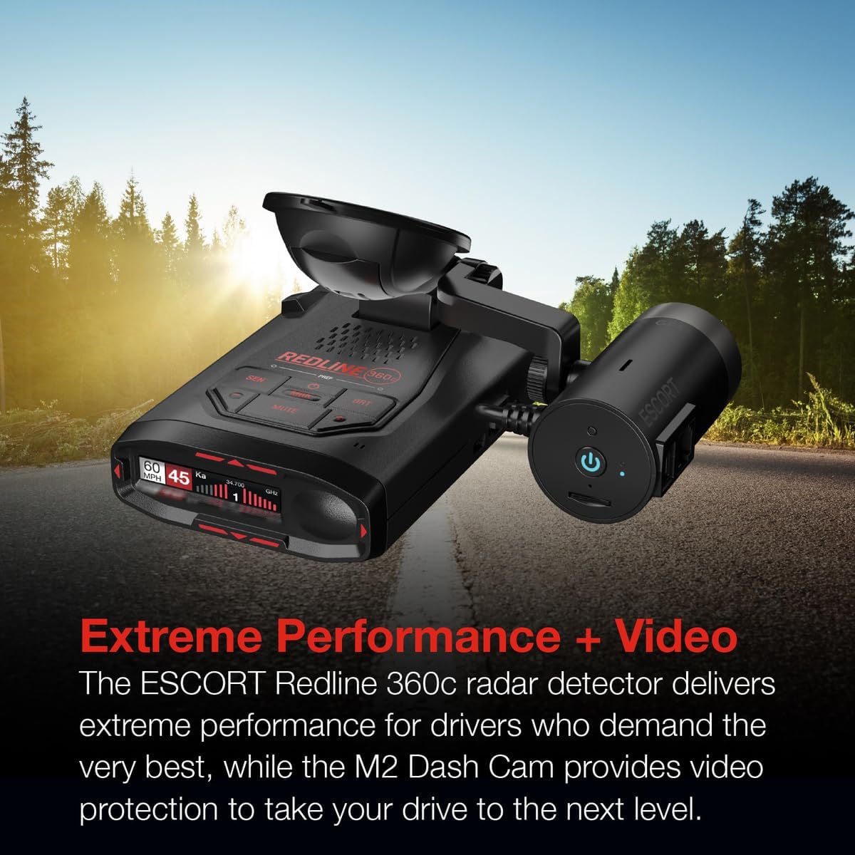 Build a complete driver alert system by combining your vehicle electronics and pairing the M2 smart dash cam with the Redline 360c, The Redline 360c is not for everyone, only those who expect the best. Never settling, never cutting corners. We delivered the best of the best for the people who expect high-end performance. The new technical standard for driver alert systems with 2X the range, 360 degree directional awareness, and 100 percent stealth. Paired with the power of ESCORT Live, you have the ultimate in driver protection. Our exclusive driving community allows you to share and receive real-time alerts through the app or when any ESCORT detector senses a threat. Easily manage your M2 settings, features, and video footage, all from a single, unified Drive Smarter app. The 1080P monitor gives you stunning footage for when you need it. The M2 WiFi camera ensures a flawless connection to the cloud and allows you to receive automatic software updates and alerts. Allow this car camera to equip you to be better prepared for emergencies. Emergency mayday alert will send your emergency contact an automatic text message in the event of a serious accident. Have peace of mind knowing that somebody was contacted for your protection. This dashboard camera will save and lock recordings in the event of a crash, G-sensor events, or if you press the emergency recording button. Drive safer and smarter with the Escort M2 dash camera.
