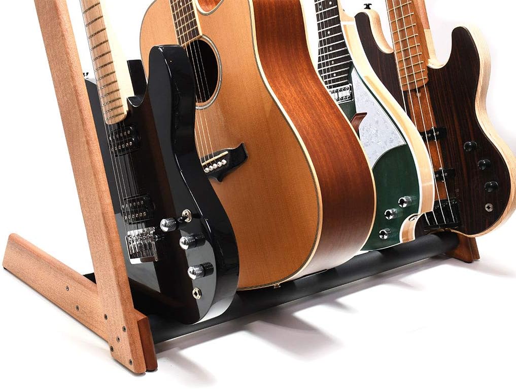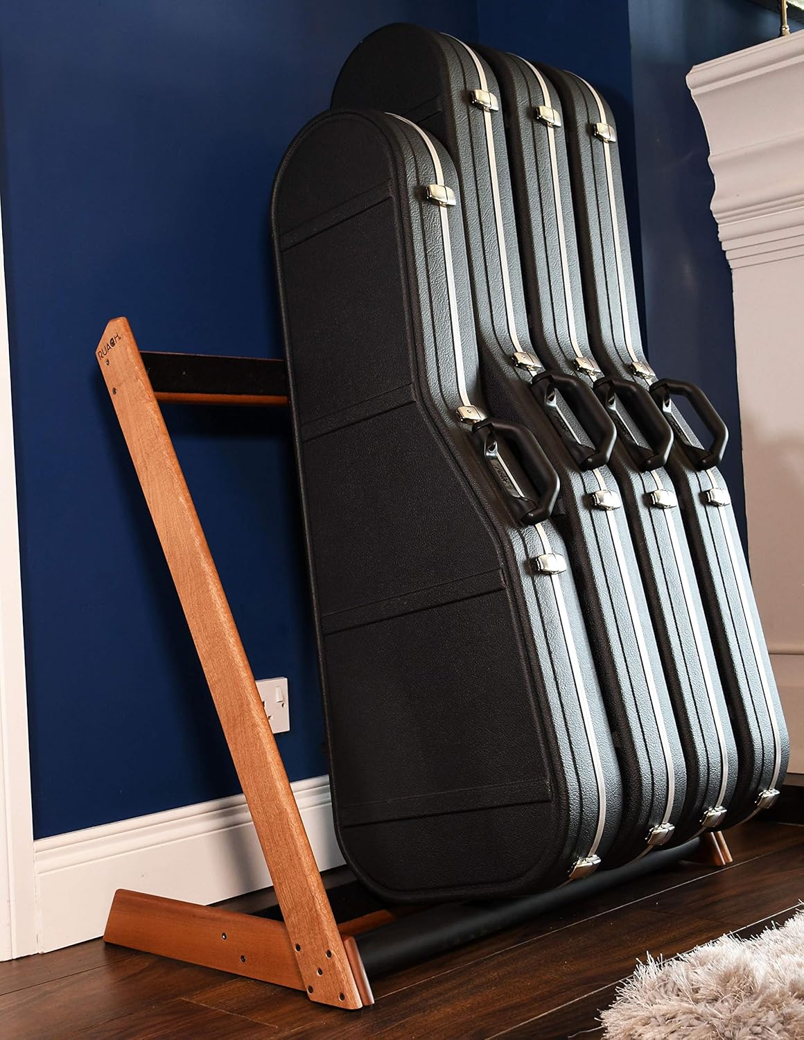 This premium solid hardwood 5 way guitar and case stand was designed to allow you to showcase your beautiful guitars and cases in your home or studio, and do so with style. The unique advantage of this guitar rack is that you can customize it in seconds. You can hold 5 guitar stands, 5 guitar cases, or a mixture of both - depending entirely upon your personal collection, and what you would like it to display. Featuring a solid mahogany wooden structure, this guitar and guitar case rack arrives flat packed and is able to be assembled in little time using our simple "4 Step Guide" provided in the box - so you can present your guitars in style within minutes of delivery. This stand will cater for full size acoustic guitars, electric guitars and bass guitars.