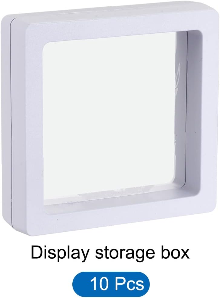 What is this?The display storage boxes are made of ABS frames and flexible TPU film, lightweight, durable, with great elasticity, and high transparency.What will I get?The display storage box, in size of: Size: 5cm x 5cm x 2cm/1.97 inch x 1.97 inch x 0.79 inch(L*W*H); Color: White; Shape: SquareIn the package of 10 x display storage boxAre there any advantages of the product?The frame display case makes your jewelry float between two flexible transparent films, adding a 3D suspending effect. Sealed to prevent the jewelry from collisions and scratches. This display case is not only for ring necklace bracelet earrings, it can also be used for coins, stamps, etc.How to use it?Due to the clasp frame design, simply push and open the jewelry storage box, place objects between the clear film and adjust the position, close the box.What should I notice?All size is measured manually, please allow +/-0.1 inches error.
